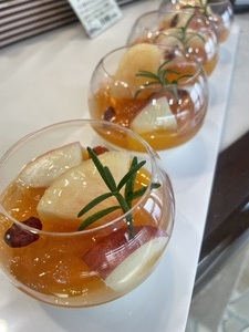 山梨県ゆうき農園さんが再現に成功した幻の葡萄アジロンダック(1970年に勝沼で国産第一号の赤ワインが作られた時に使用された葡萄、栽培に手間がかかるため作る農家さんが激減)を皮ごと煮詰めてピューレにしてソースに。中にもアジロンのソースとスペイン産ケスクレムチーズを入れました。周りにはその日にお店にあるありったけのフレッシュの葡萄(だいたい6種類ほど)を飾りました。葡萄好きの方には是非食べていただきたい!